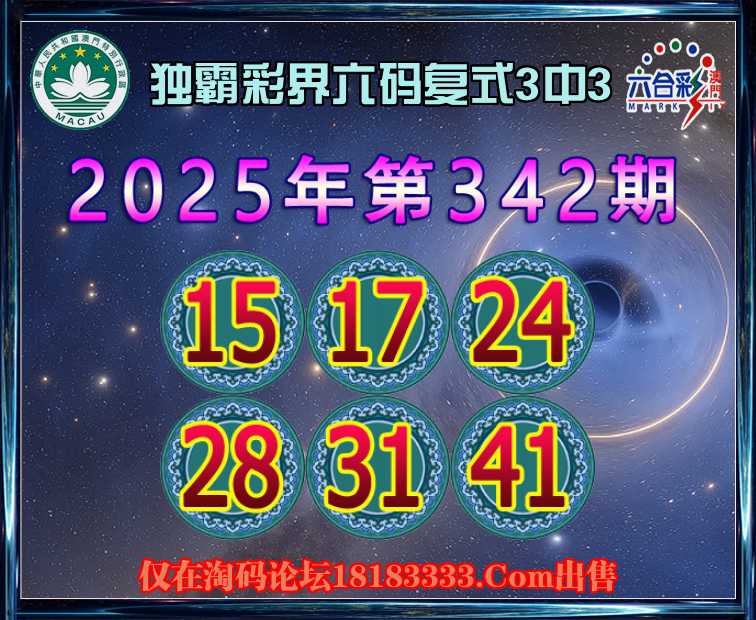 342期:【独霸彩界】 六码复式3中3