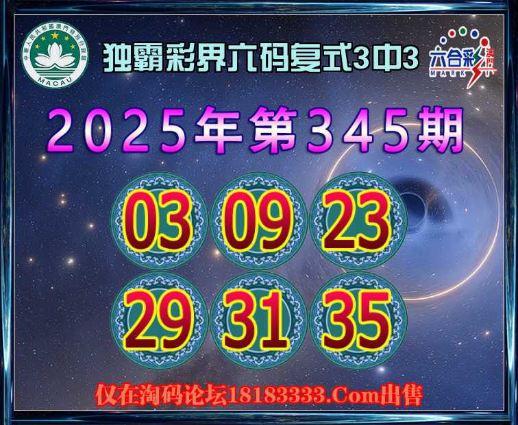 345期:【独霸彩界】 六码复式3中3