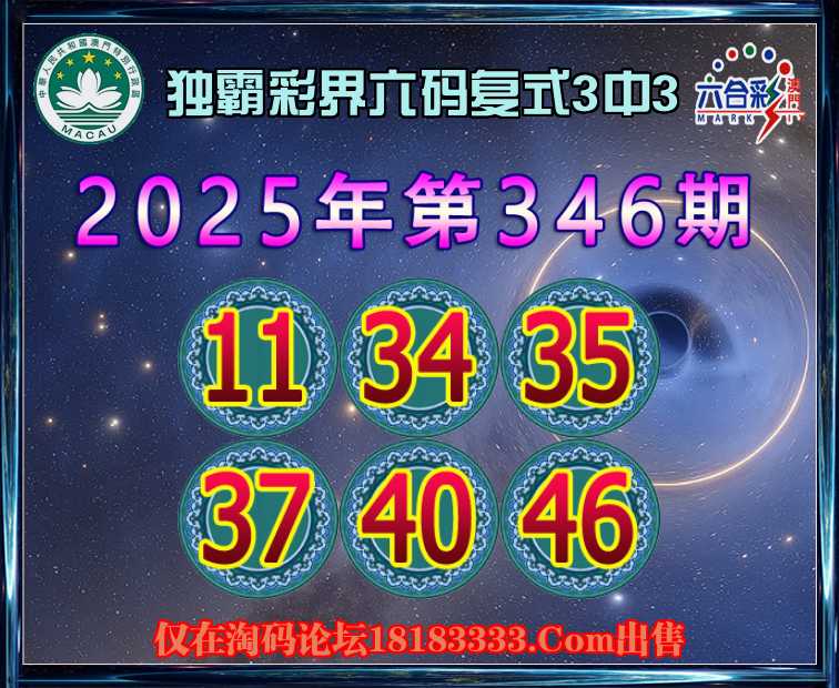 346期:【独霸彩界】 六码复式3中3